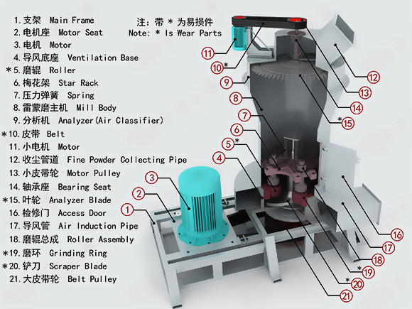 雷蒙磨粉機工作時,磨輥在離心力作用下緊緊地滾壓在磨環上,鏟刀鏟起物料送到磨輥和磨環中間,物料在碾壓力的作用下破碎成粉,然后在風機的作用下把成粉的物料吹起來經過分析機,達到細度要求的物料通過分析機,達不到要求的重回磨腔繼續研磨,通過分析機的物料進入旋風分理器分離收集。其排風采用工業濾布隔離排風,可一次成粉。
